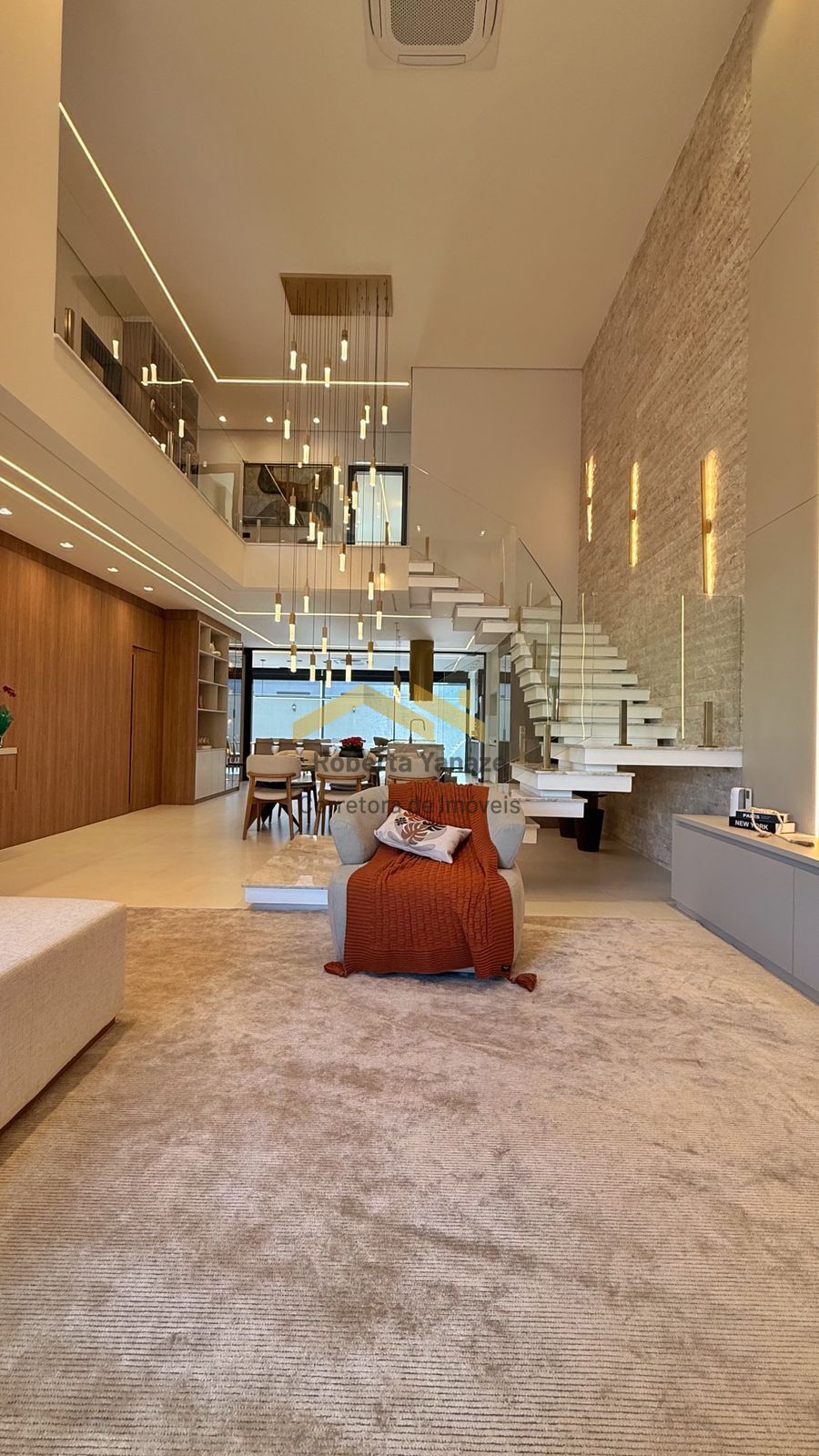Ao entrar, você é recebido por uma imponente sala de estar com pé-direito duplo, equipada com ar cassete de alta potência e soundbar, criando um ambiente perfeito para relaxar ou receber convidados. A sala de jantar impressiona com um lustre exclusivo de 25 pendentes em rocha selenita dourada fosca — um verdadeiro destaque de design.